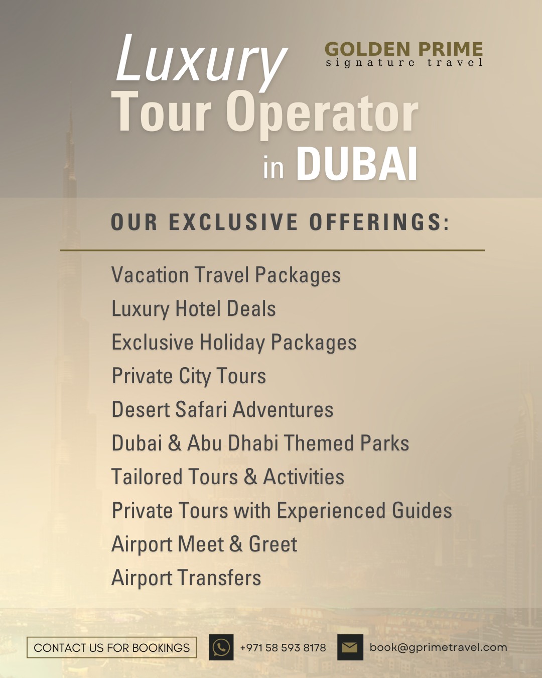 Golden Prime Travel in Dubai specializes in luxury and medical travel services, delivering bespoke experiences with a strong focus on personalized planning and expert guidance. Their offerings cater to clients seeking a seamless, top-tier travel experience, whether for leisure, business, or healthcare needs. From exclusive accommodations and private tours to specialized medical treatments and wellness retreats, Golden Prime Travel ensures a hassle-free journey with meticulous attention to detail, comfort, and convenience. Their team of professionals is dedicated to crafting unique itineraries that reflect each client’s preferences, making Golden Prime a premier choice for discerning travelers in Dubai.