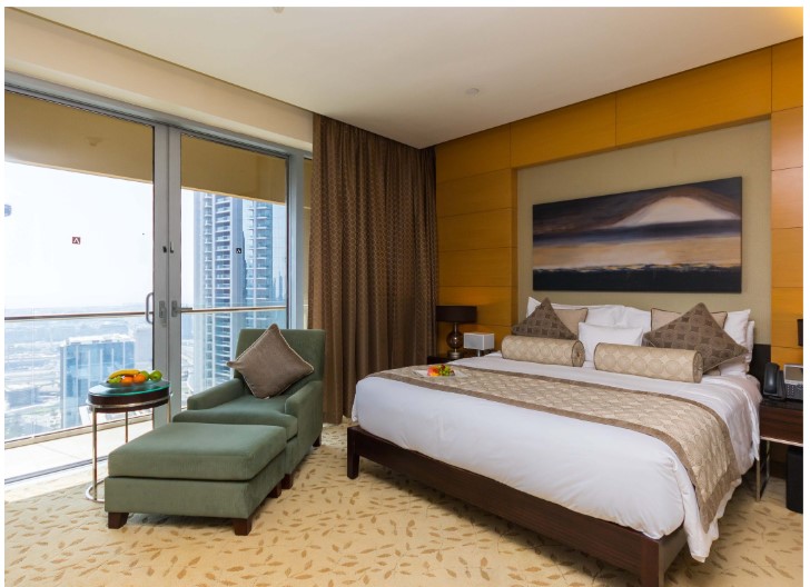 Spacious apartments: studios, one‑bed, two‑bed, three‑bedroom units, penthouses. Sizes vary; for example, a three‑bedroom apartment (Burj Residences) is ~250 m².